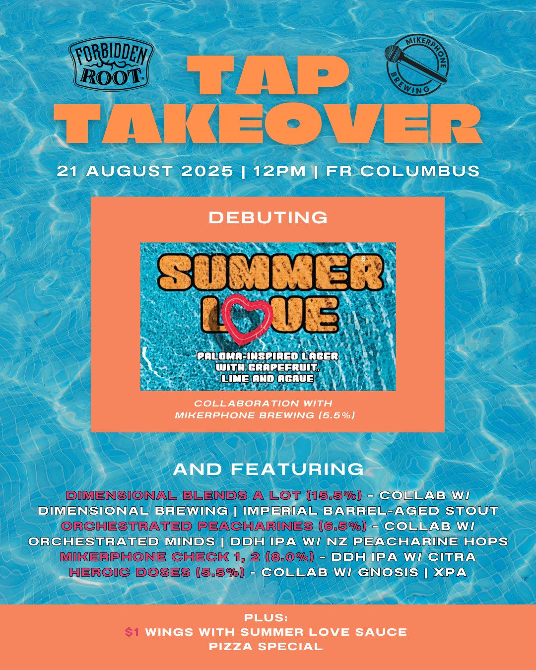 Forbidden Root is hosting a tap takeover by multi-award winning Mikerphone Brewery out of Chicago. Featuring collabs from Gnosis, Dimensional, Orchestrated Minds and, of course, Forbidden Root!.